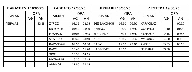 Σας ενημερώνουμε ότι λόγω των δυσμενών καιρικών συνθηκών που αναμένονται, τα δρομολόγια του πλοίου BLUE STAR MYCONOS από την Παρασκευή 16/05/2025 (αναχώρηση από Πειραιά) έως τη Δευτέρα 19/05/2025 (άφιξη στον Πειραιά), θα διαμορφωθούν σύμφωνα με τον παρακάτω πίνακα και εν συνεχεία ως εγκεκριμένα.