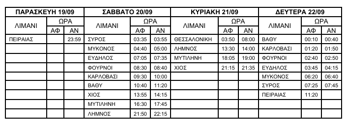 Σας ενημερώνουμε ότι σύμφωνα με Δελτίο της Ε.Μ.Υ σήμερα Παρασκευή 19/09/25, ισχύει απαγόρευση απόπλου στις περιοχές πλου του Ε/Γ-Ο/Γ Blue Star Myconos. Ως εκ τούτου, το πλοίο θα αναχωρήσει από Πειραιά την 23:59 (αντί 15:00) και μέχρι τη Δευτέρα 22/09/2025, τα δρομολόγιά του, θα τροποποιηθούν σύμφωνα με τον παρακάτω πίνακα.